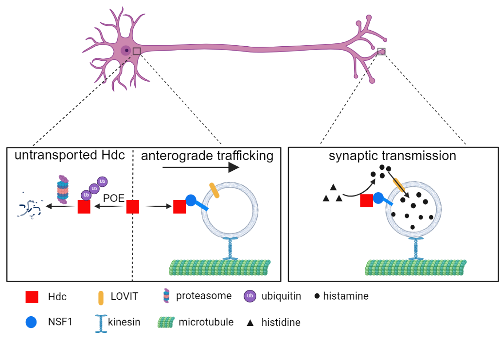 本篇文章发现神经递质组胺的合成与其囊泡转运过程在轴突末梢偶联。感光细胞胞体合成的Hdc通过囊泡的轴突运输到达轴突末梢富集,而滞留在胞体的Hdc通过POE介导的UPS系统降解。打断Hdc与LOVIT之间的偶联导致果蝇光传导受损。当UPS降解系统异常时,神经递质组胺在胞体积累并导致感光细胞死亡。这一研究揭示了神经递质稳态调节的重要性,为神经递质稳态失调相关的神经退行性疾病的研究和治疗提供了理论基础。
